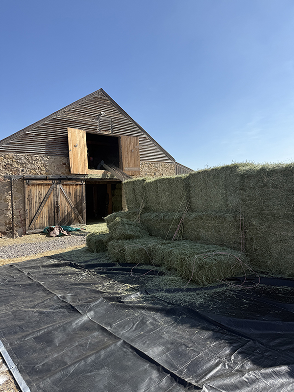 Hay is stored away from permanent or temporary structures where equines are stalled