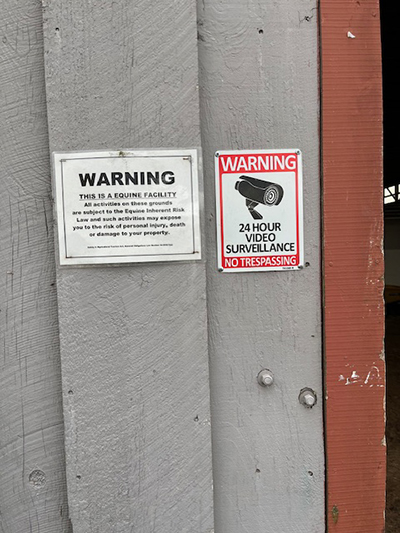 Restricted access signs are posted at primary points of access to sick, affected and/or quarantined equines